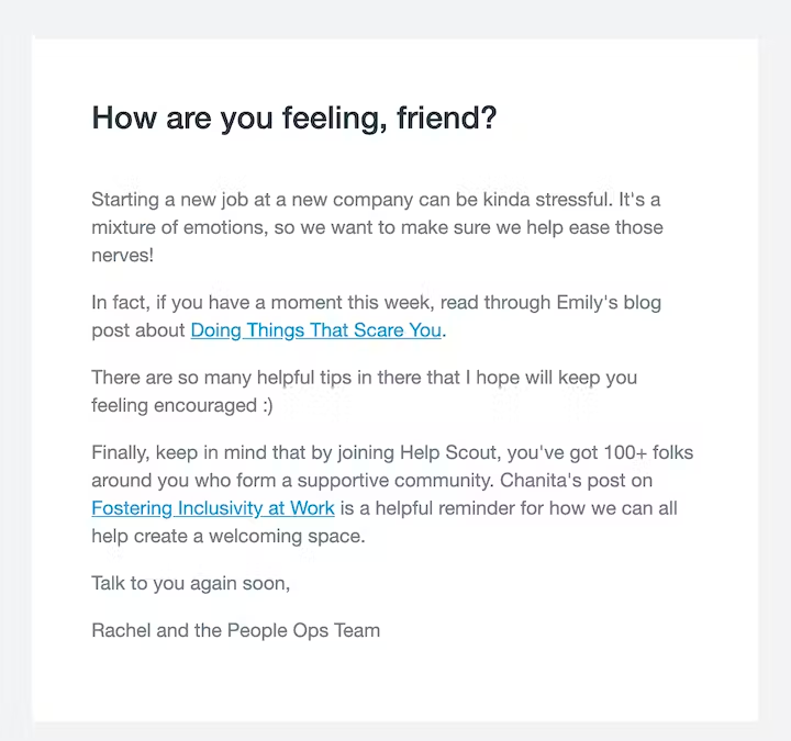 The third welcome email Help Scouts sends out to new hires. “Friend” is replaced by the person’s name.