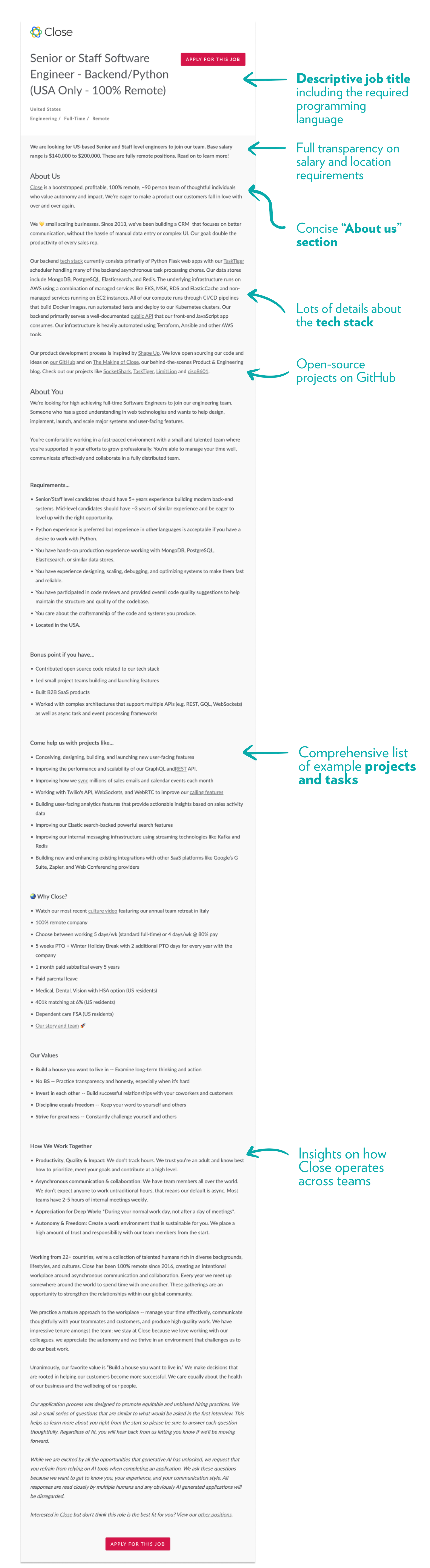 In the example above, Close makes it crystal clear that they’re looking for experienced engineers at the senior or staff level and a developer who’s excited about working in Python—and that increases the chance that candidates who match this profile will check out the details of the listing.