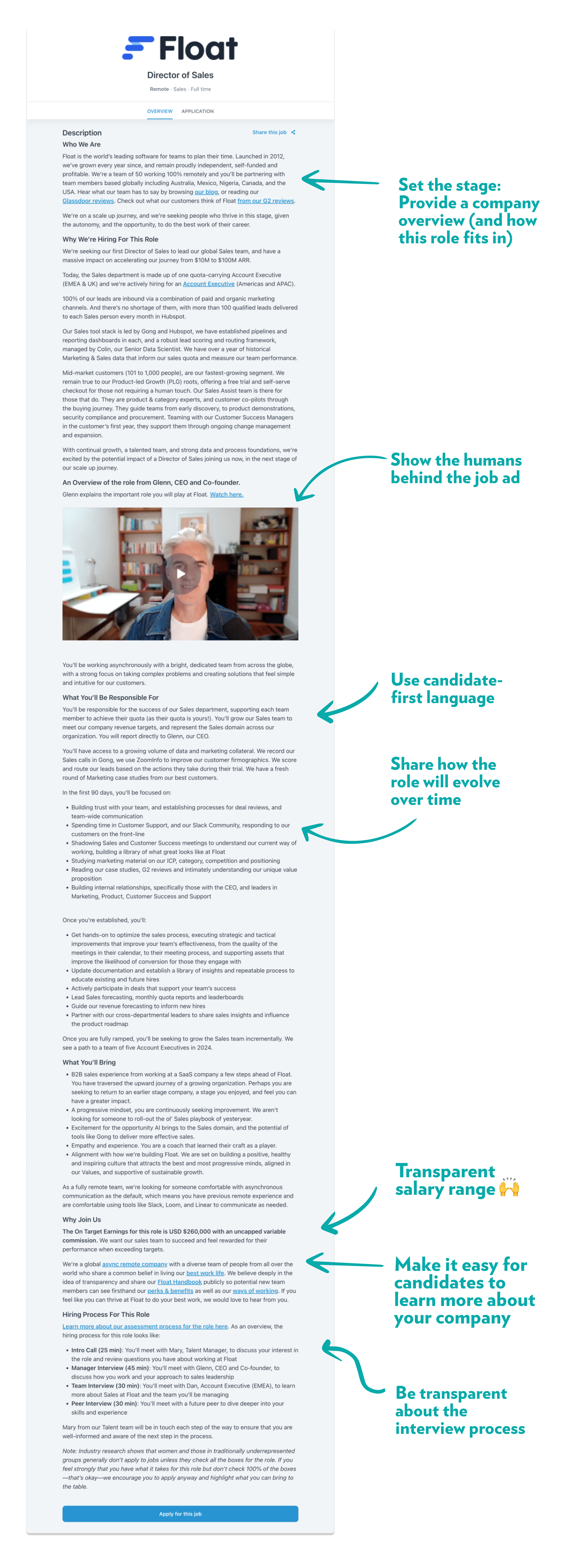 I recently read that the best-performing job posts are between 300 and 600 words long, but to me, a well-written job ad can be much longer than that. With more than 1,300 words, Float’s recent job listing had more than twice the word count, but because it’s well-structured and thoughtful, it helps candidates get a true understanding of the company and the open position.